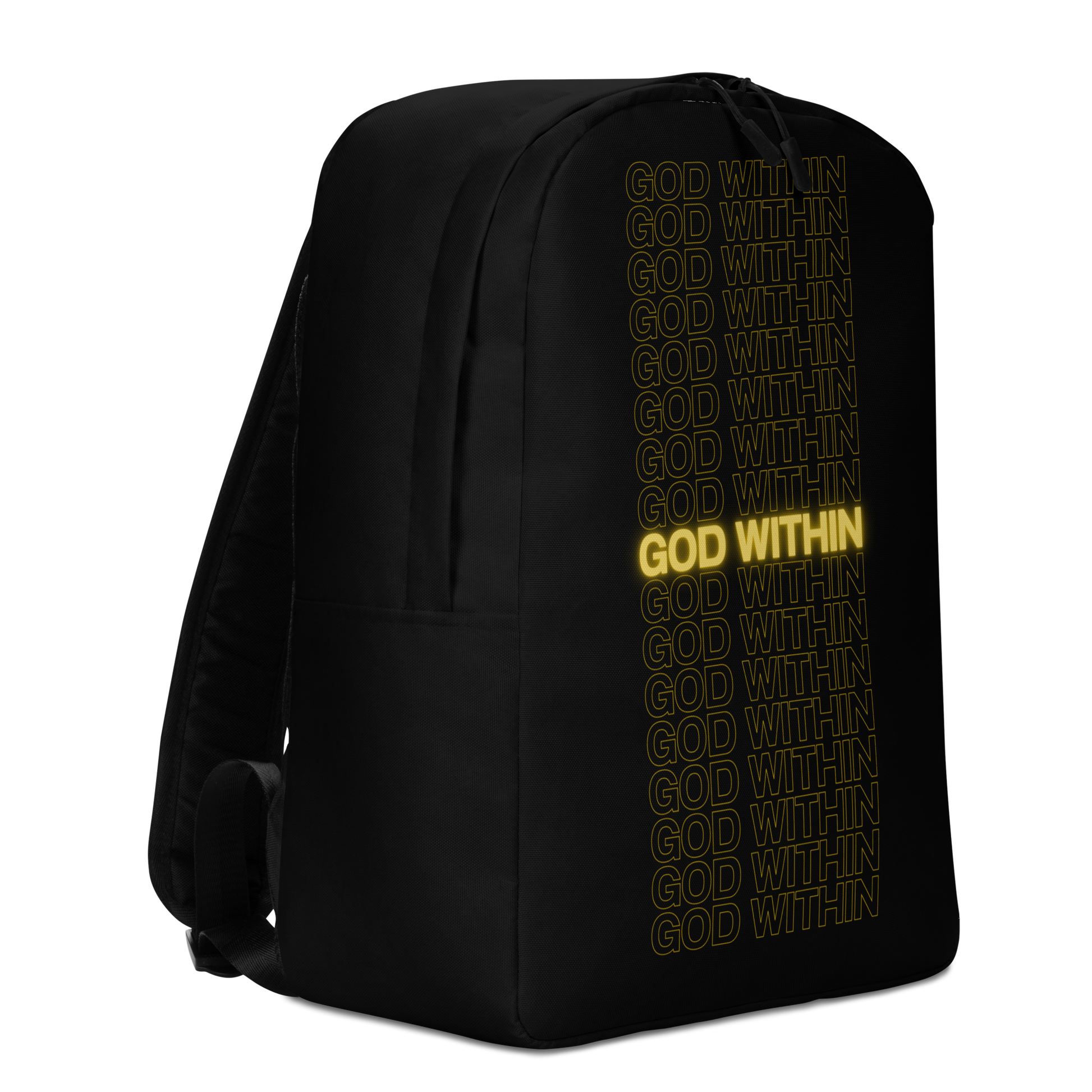 Carry your essentials with style and purpose. This all-black minimalist backpack features a bold “God Within” design on the front, serving as a quiet reminder of the strength and guidance that lives inside you.